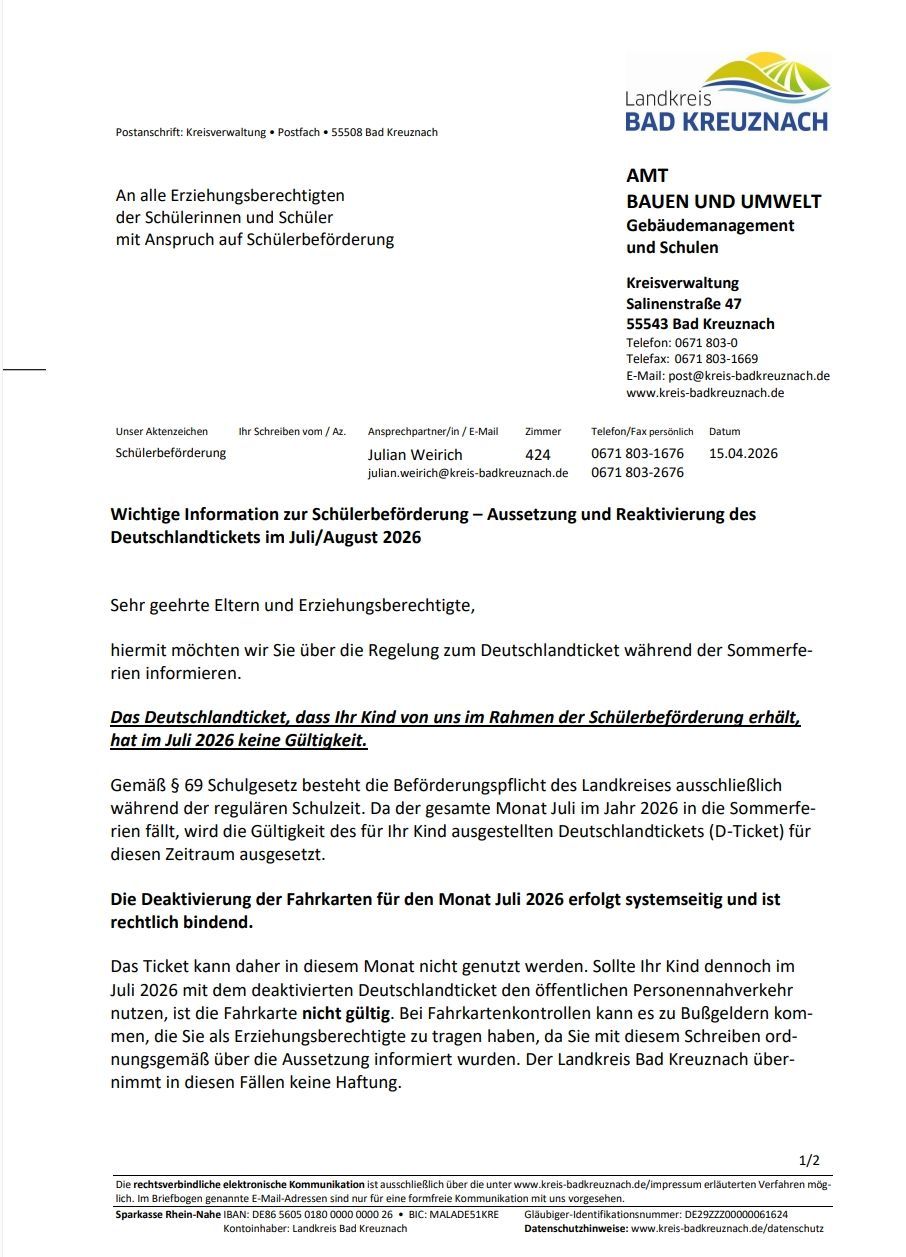Wichtige Info der Kreisverwaltung zur Deaktivierung des Deutschlandtickets im Juli 2026