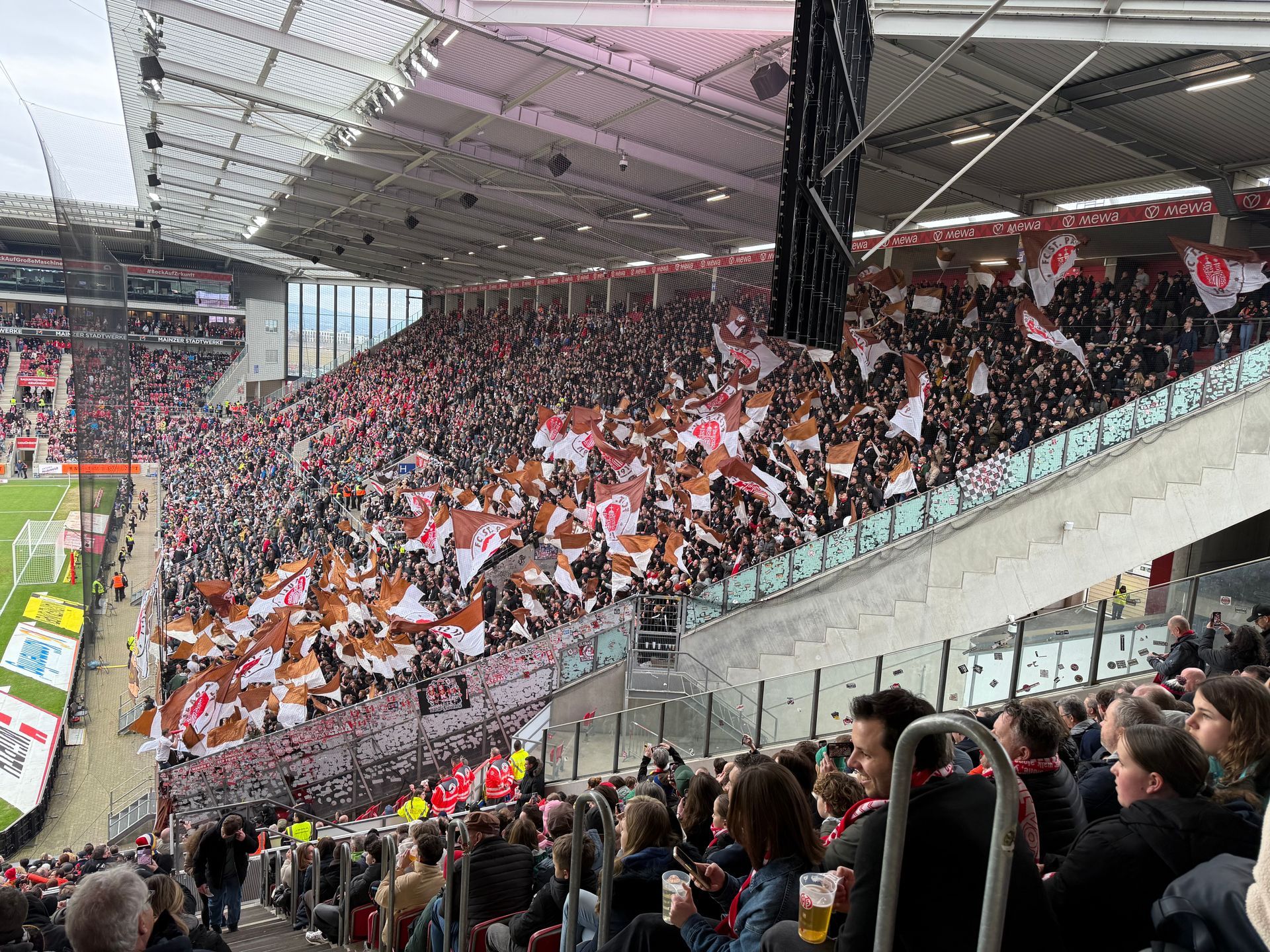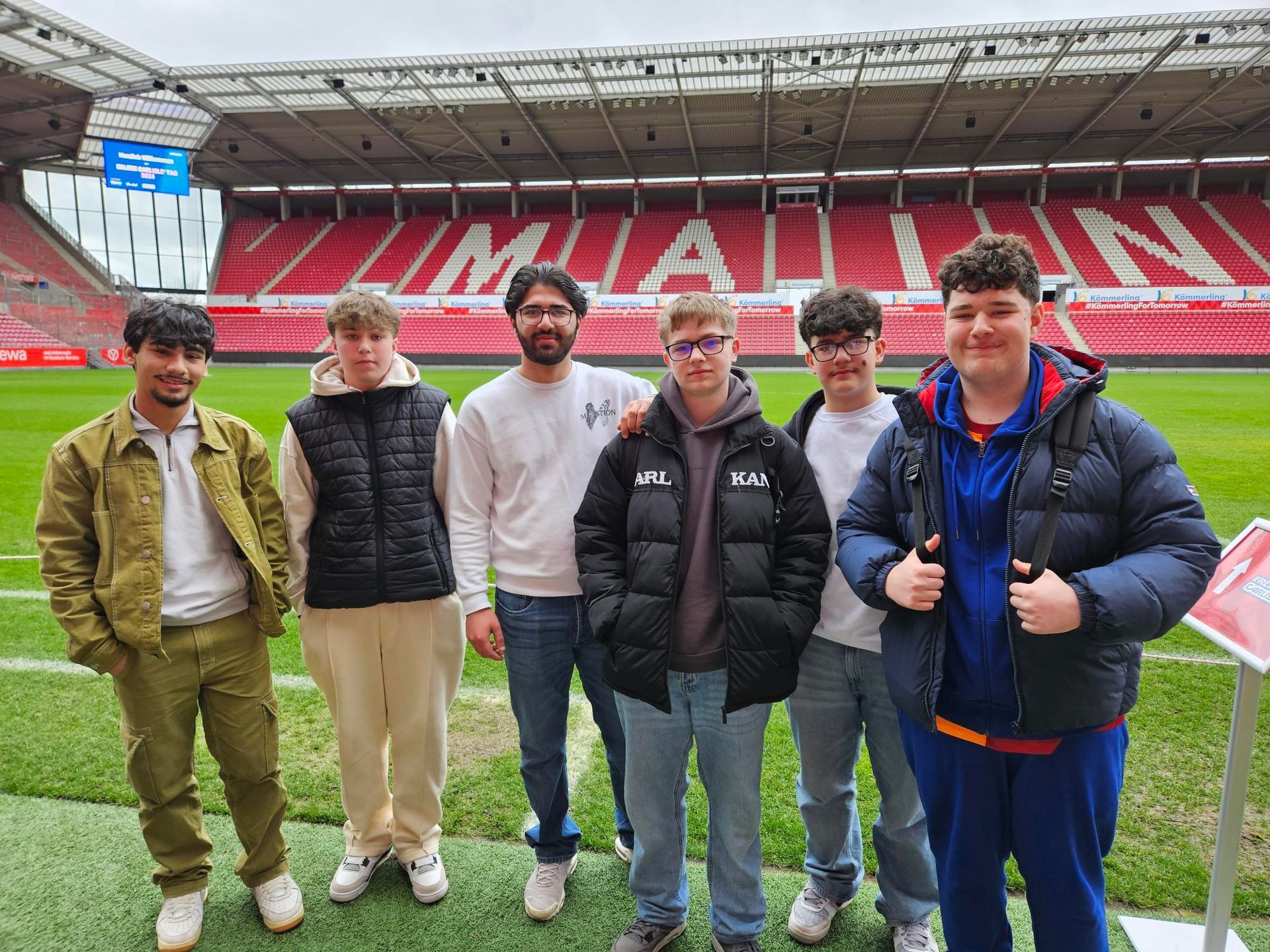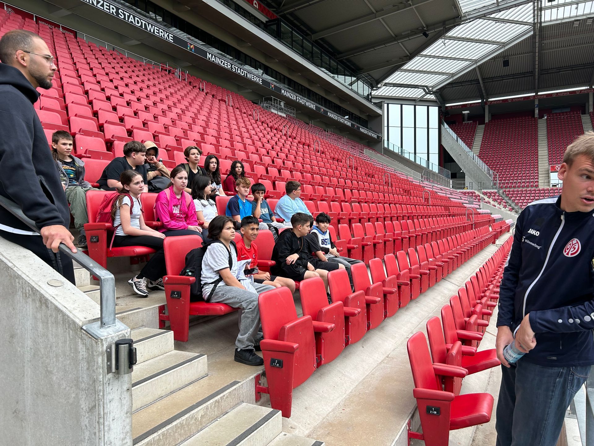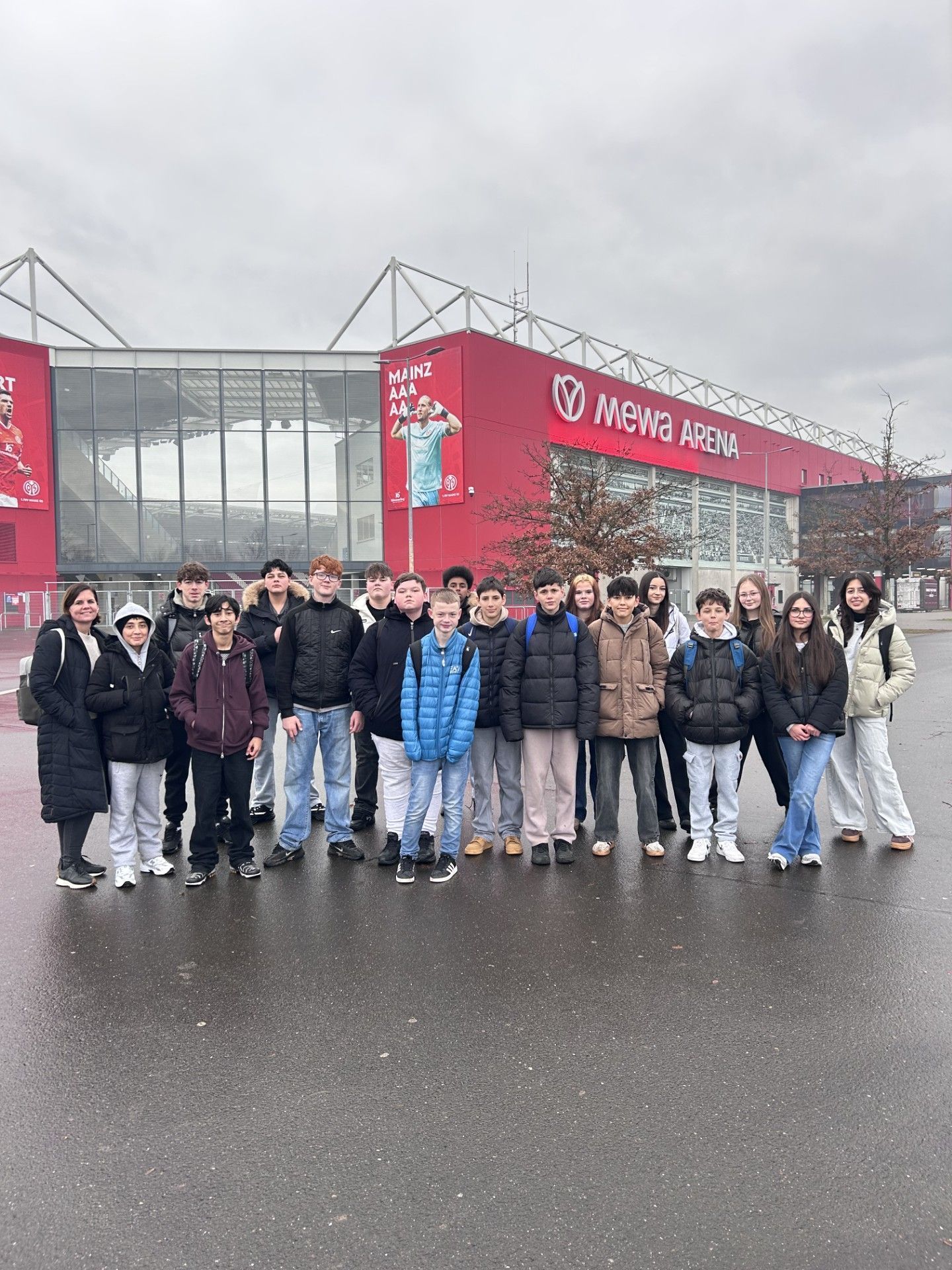 Am Dienstag, den 13.01.2026, machten sich Schülerinnen und Schüler der 8. Klassen gemeinsam mit Frau Emrich und Frau Baldauf auf den Weg nach Mainz. Start war um 8:00 Uhr am Bahnhof in Bad Kreuznach. Von dort aus ging es mit dem Zug zur MEWA-Arena, dem Stadion des Fußball-Bundesligisten Mainz 05.
