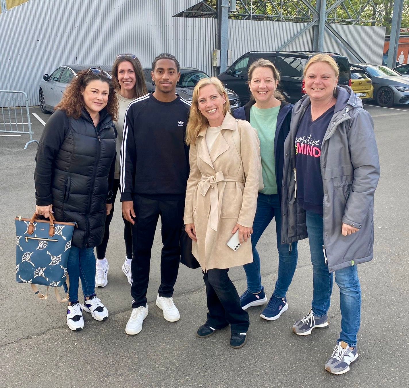 Die DaF Gruppe mit 13 Schülern und Schülerinnen plus zwei Lehrerinnen (Frau Wild und Frau Kushch) besuchten am 09.04.24 die Mewa-Arena um an einem Vortrag zum Thema „Integration/Rote Karte dem Rassismus“ teilzunehmen.