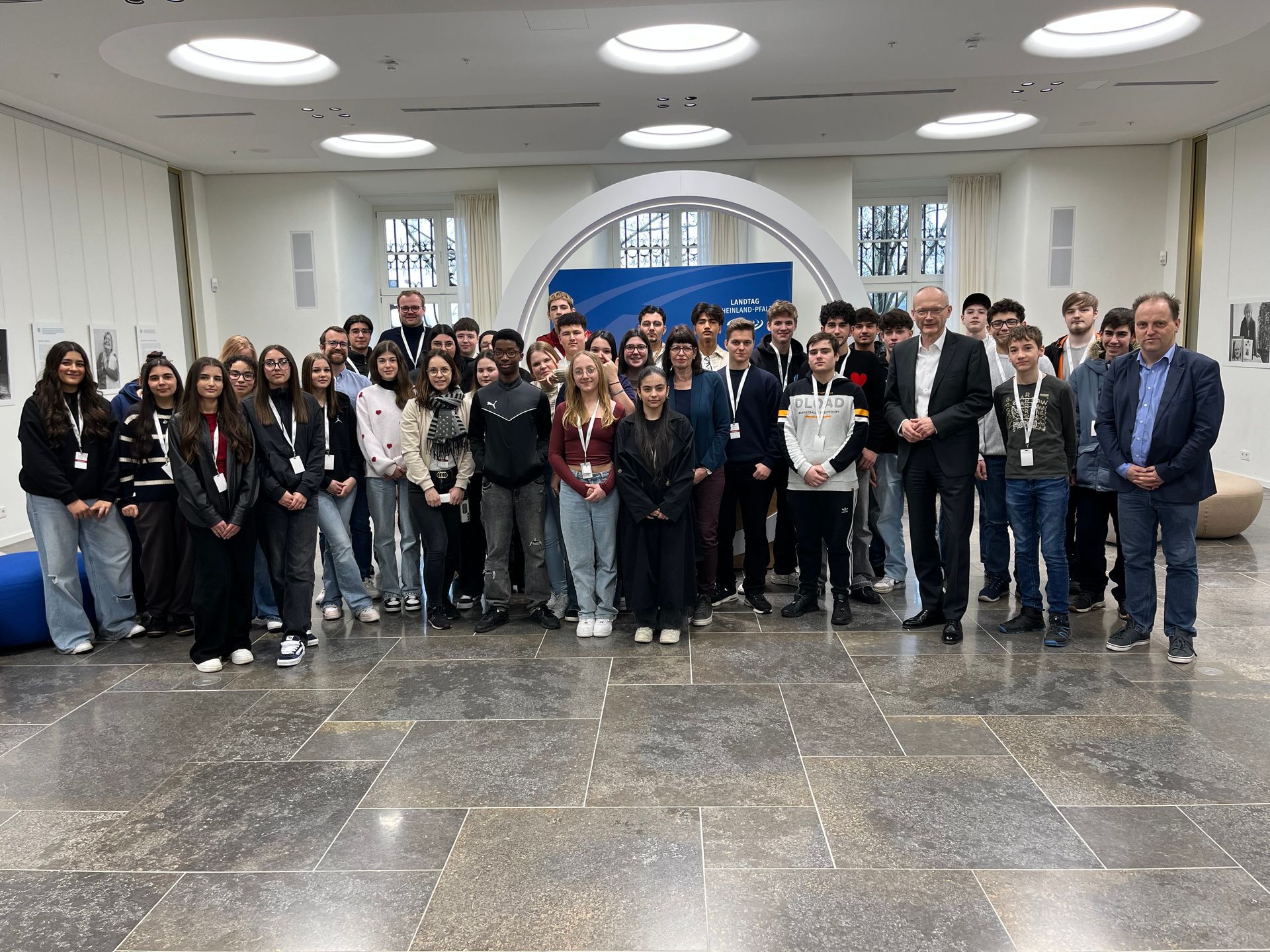 Am 21. März 2024 machten sich Josephine- Julie und Ioanna (Schülervertreter), Herr Volk (Schulleitungsteam), Frau Baldauf (Projektleitung des 05er Klassenzimmers) und Herr Kaspers (Fachlehrer) auf den Weg nach Mainz, um an der 15 jährigen Jubiläumsfeier des 05er Klassenzimmers in der MEWA Arena teilzunehmen.