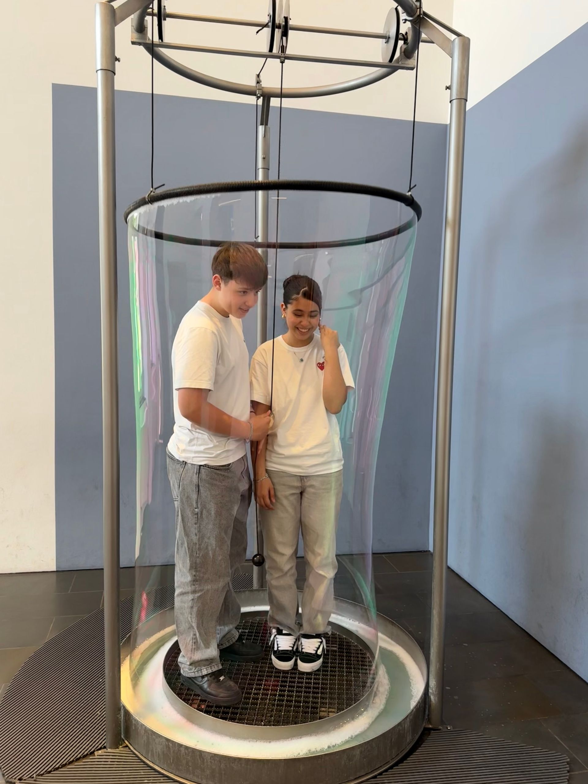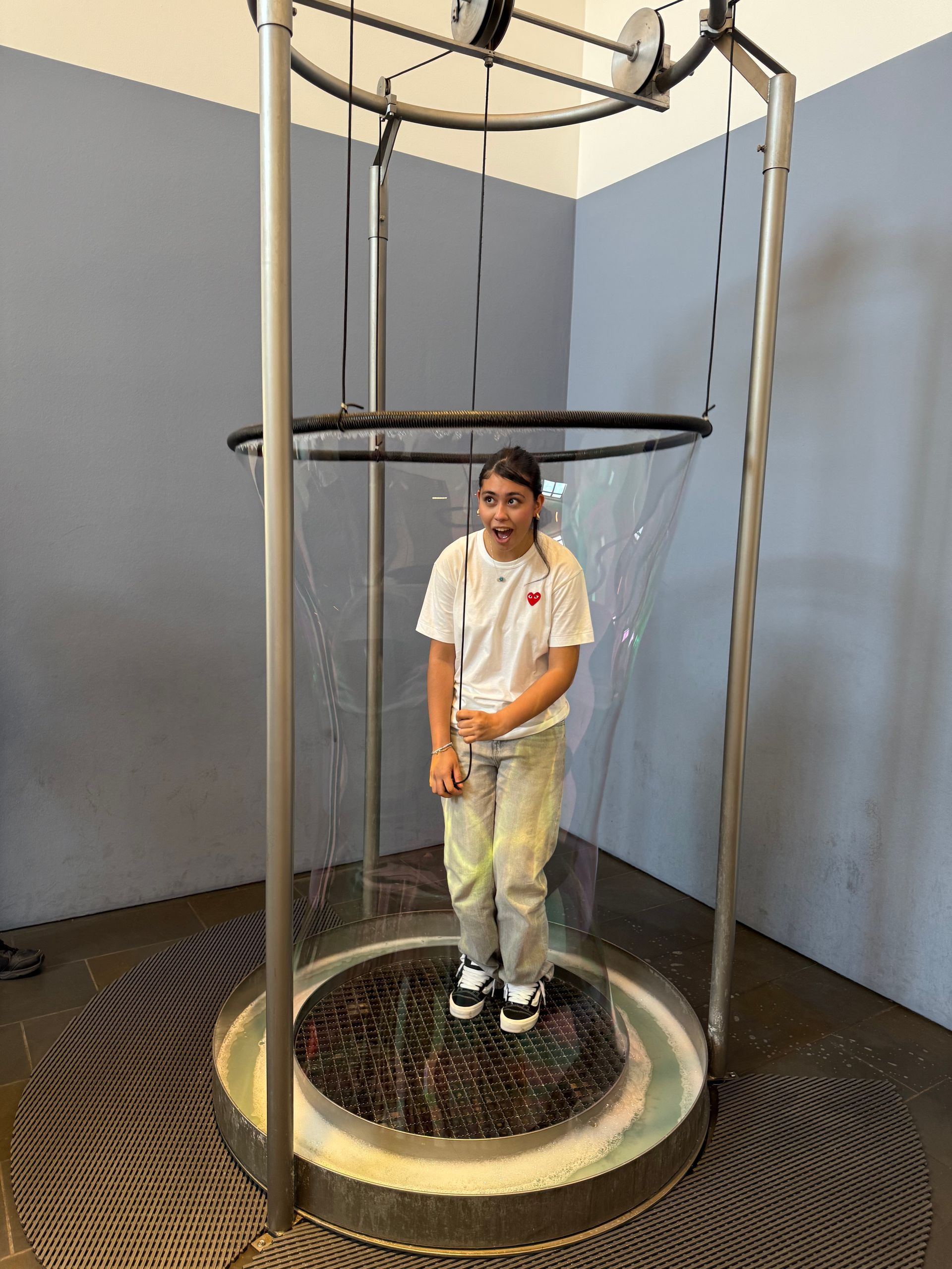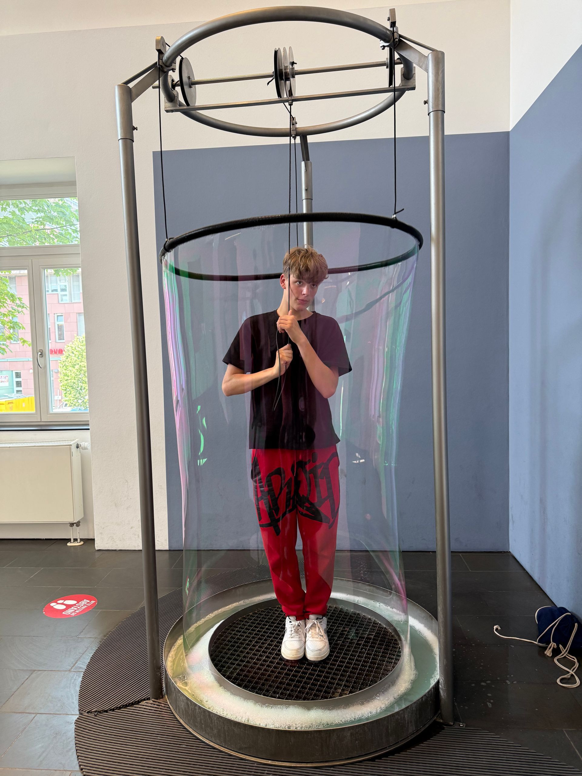 Nach einer kurzen Begrüßung durch eine Mitarbeiterin durften die Schülerinnen und Schüler die Ausstellung selbst erkunden. Über 150 Stationen laden dazu ein, zu knobeln, zu bauen und zu experimentieren. Besonders beeindruckt hat die riesige Seifenhaut, in die man sich stellen kann, die Kugelbahn und die vielen mathematischen Spiele mit geometrischen Formen, Zahlen und Logik.
