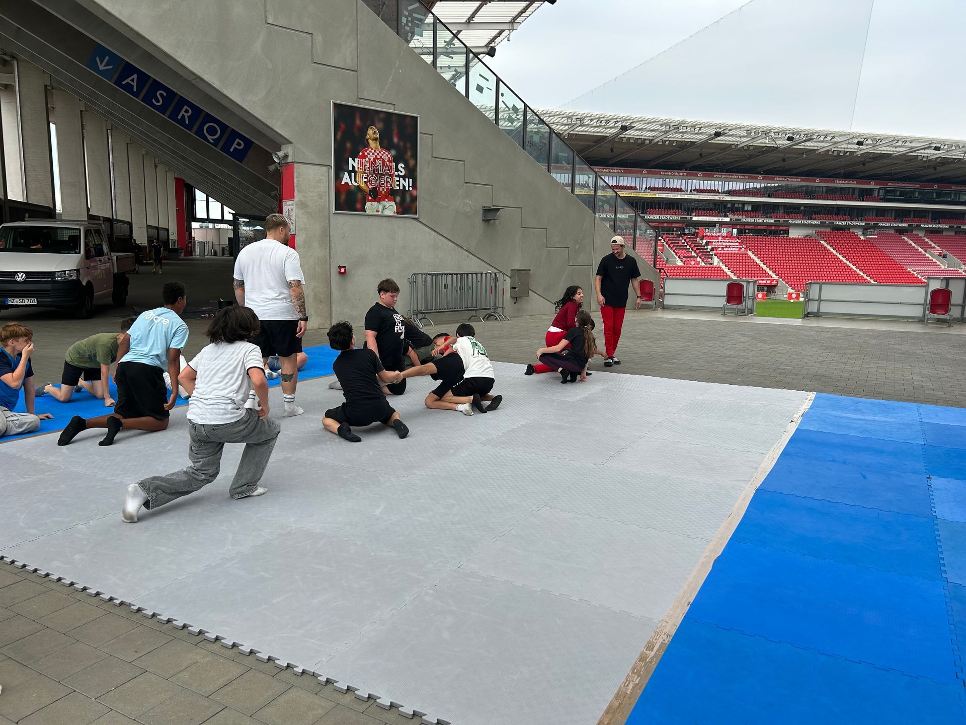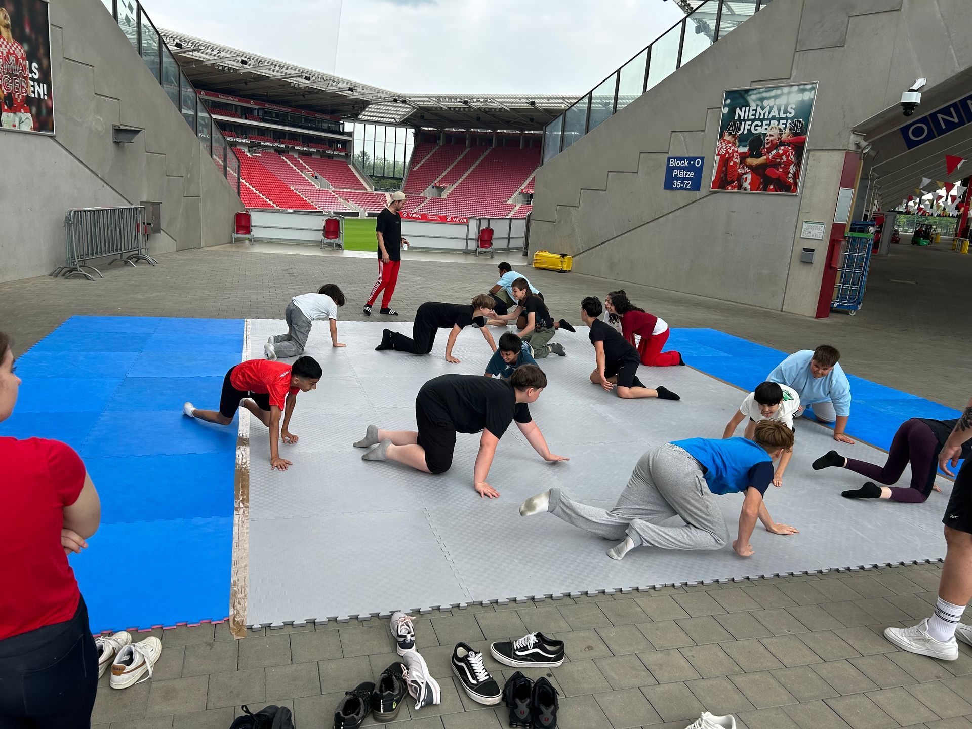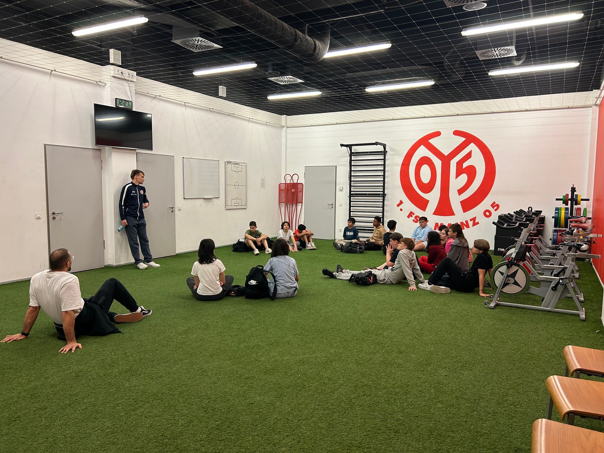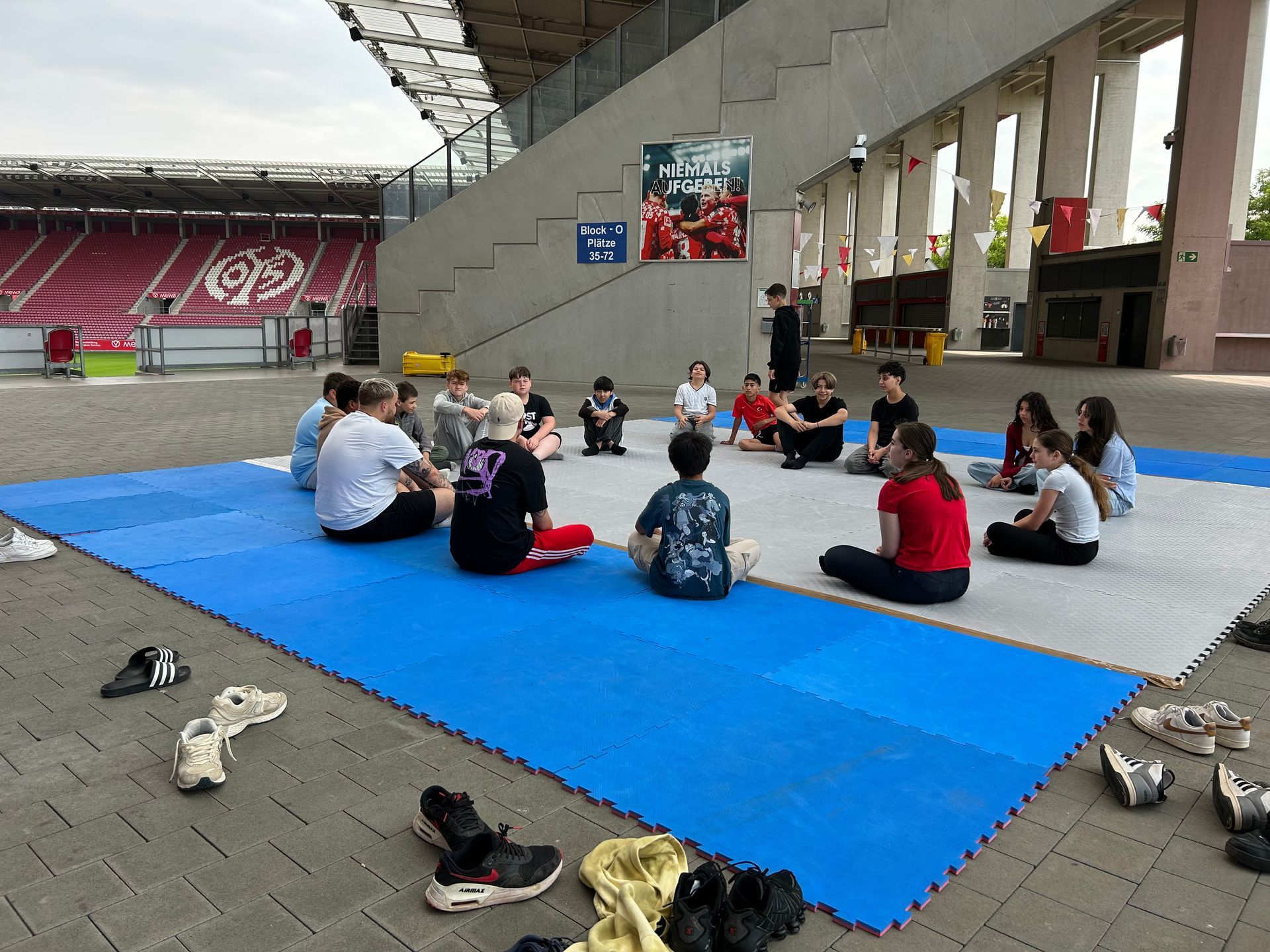 Am Kreuznacher Bahnhof stiegen wir in den Zug und fuhren nach Mainz. Als wir in Mainz ankamen, mussten wir noch einmal in einen Bus umsteigen und dann ein paar Minuten laufen, bis wir dann endlich an der MEWA Arena ankamen. Dann ging es mit der 7a um 10 Uhr mit dem Workshop los. Während die 7c eine Stadionführung besuchte, hatten die 7a Faires Tackling: