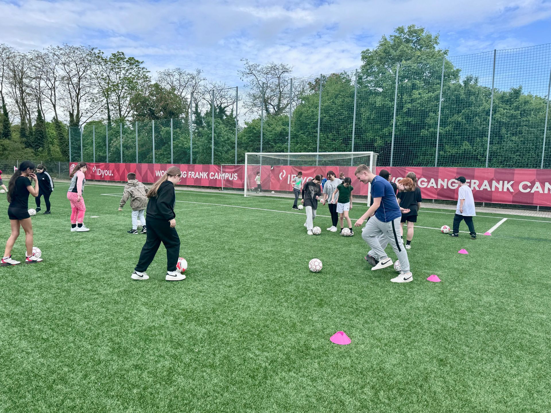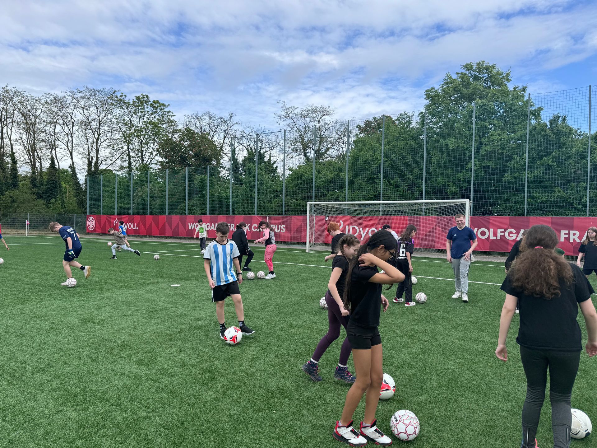 Unter dem Motto „Trainieren wie die Profis“ wurde es für die Schülerinnen und Schüler der Sonnenbergschule schweißtreibend: In einer 90-minütigen Trainingseinheit wurde auf dem Wolfgang-Frank-Campus, auf dem Gelände des Bruchwegstadions, nicht nur „Fußball“ gespielt.