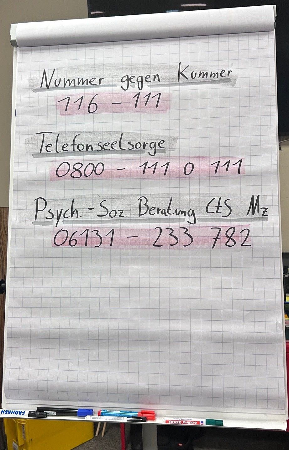 Gemeinsam wurde außerdem erarbeitet, welche Hilfsmittel und Strategien dabei helfen können, mit belastenden Situationen umzugehen. Die Schülerinnen und Schüler reflektierten, welche Verhaltensweisen hilfreich sind, um sich besser zu fühlen, und welche Strategien eher ungünstig oder wenig hilfreich sein können. Ergänzend dazu wurden verschiedene Unterstützungs- und Hilfsangebote vorgestellt, darunter schulische Ansprechpartner sowie externe Beratungsstellen mit entsprechenden Adressen.