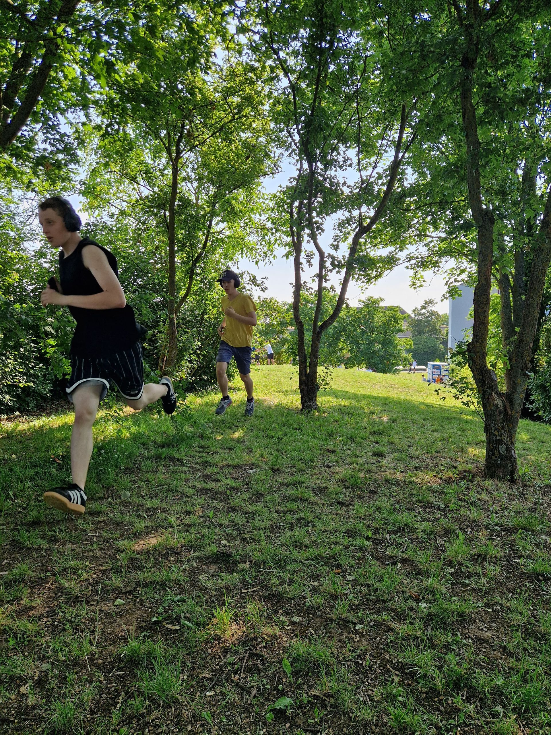 Wir spielten keinen Fußball und bekamen ein Bild und sollten den abgebildeten Menschen beschreiben (Name, Alter, Hobby usw.). Danach stand ein Mann in der Mitte und stellte uns Fragen. Sobald die Frage positiv beantwortet wurde, durften die Schüler aufstehen und den Platz wechseln. Die Schüler, die negativ antworteten, blieben sitzen.