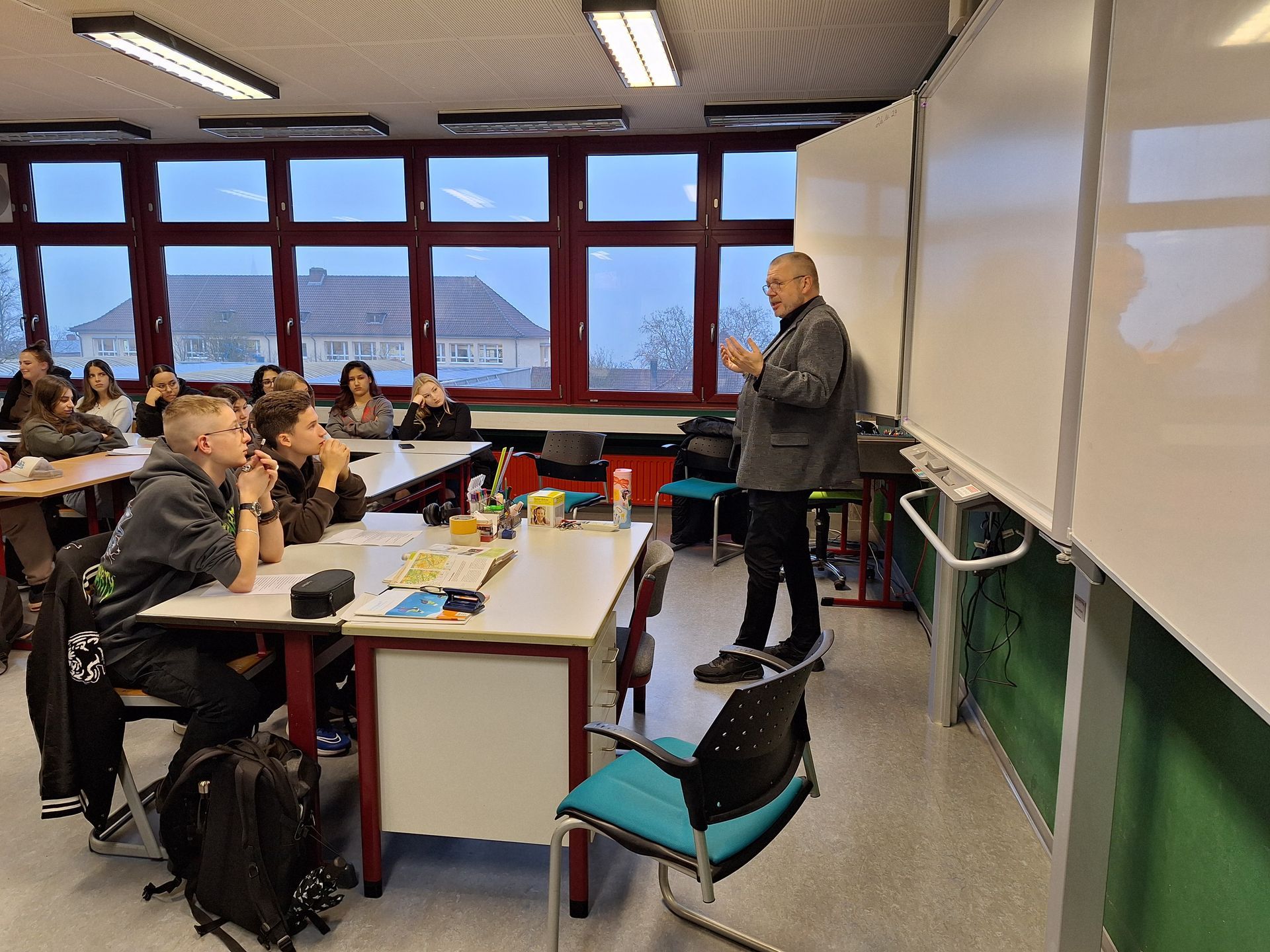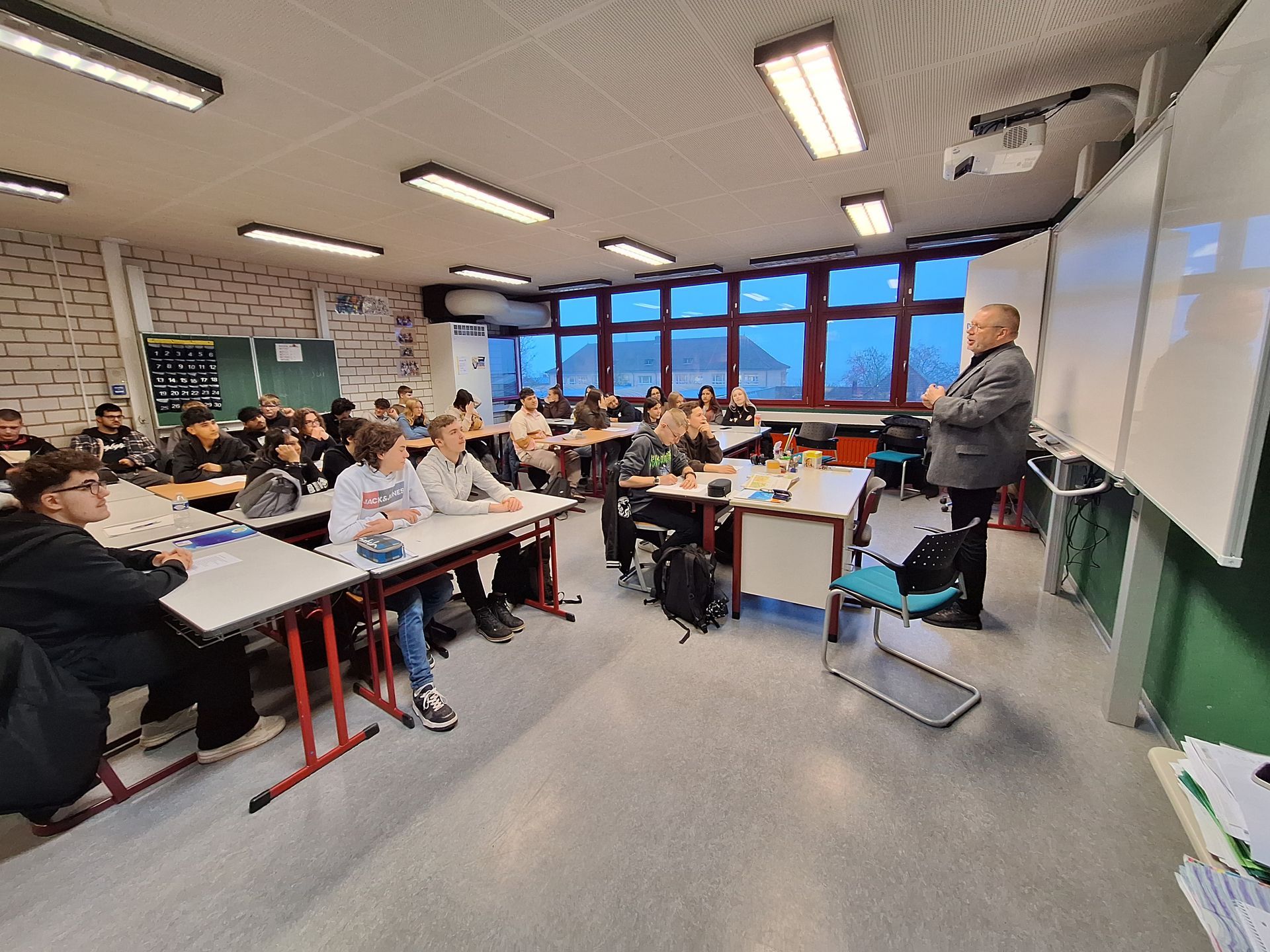 Am 07.11.2025 hatte die Klasse 9c im Rahmen des Sozialkundeunterrichts die Gelegenheit, die mit zwei Beamten der Polizeidirektion Bad Kreuznach in Kontakt zu treten. Zwei engagierte Polizisten waren eingeladen, um den Schülern einen Einblick in ihren Berufsalltag zu geben.